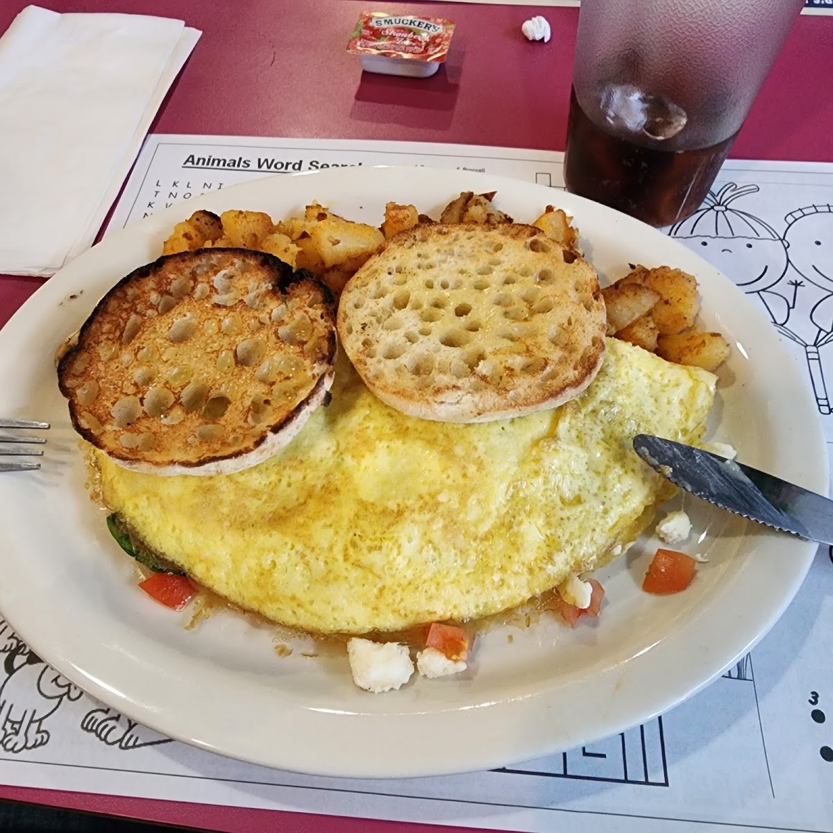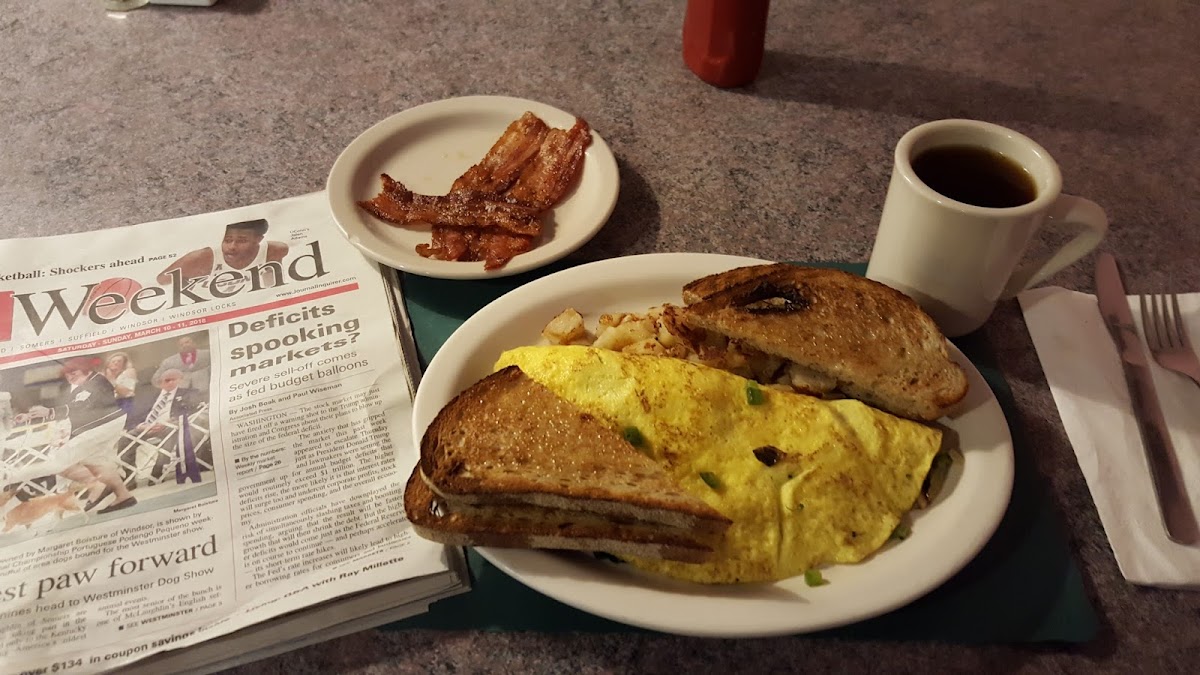A solid 5. Great find near my hotel. The 3 egg veggie omelette is chock full of fresh vegetables and cheese. Plenty of leftovers for another breakfast at work. The side of bacon was totally worth it. The home fries were cooked just right and not greasy. The rye toast from NYC is to die for. Kevin's coffee is very good. The server is very friendly and the kitchen is prompt. She did the follow up which is hard to find in most places these days. The ambiance is just right.